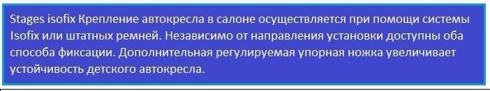 Автокресло joie Stages isofix устанавливается на заднем сиденье, как против хода, так и по ходу движения, в зависимости от роста и веса ребенка. Крепление осуществляется. Фиксация одновременно штатным ремнем безопасности и с помощью основания ISOFIX. Удобная система фиксации гарантирует простое и надежное крепление в салоне автомобиля. Опорная нога, якорное крепление и тому подобные системы создавались и создаются главным образом для увеличения уровня безопасности при транспортировке самого важного человека в мире — вашего ребёнка.