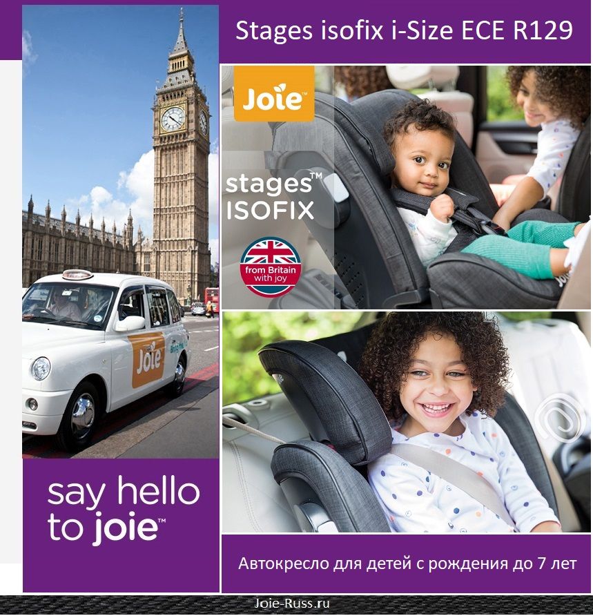 - Детское автомобильное кресло Joie Stages isofix предназначено для детей в возрасте от рождения до 7 лет и соответствует новому стандарту безопасности i-Size.